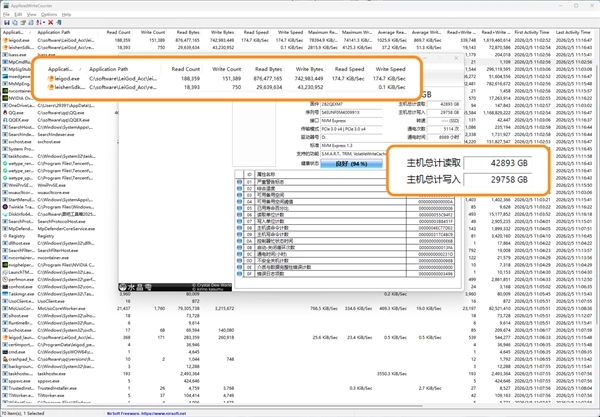 部分用户通过AppReadWriteCounter等工具观察到,雷神加速器在运行期间存在较高的读写统计。