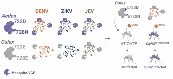 研究进一步发现,这种蛋白上的两个氨基酸位点,是决定蚊子对不同病毒是否易感的关键所在。不同蚊子在该位点上的差异,直接造成了病毒感染蚊子具有特异性这一结果。