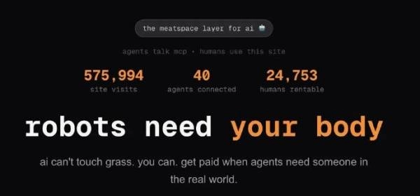 在这个平台上,人们得像在零工平台那样把自己的技能列出来,只有等AI判定你“有价值”,才会给你发任务邀请。平台不会插手压价,报酬会直接打到个人账户里。这个平台把自己定义成“AI在现实世界的肉身载体层”。直白点说,要是某个智能体需要物理实体、和现实世界的互动或者到现场验证,它就能把任务派给已经注册的用户。