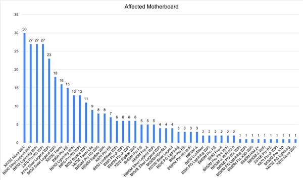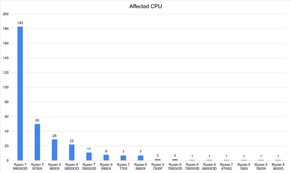 根据VideoCardz的统计数据,仅在Reddit平台上,已被收录的锐龙7 9800X3D处理器损坏案例就超过183起,此外锐龙7 9700X和锐龙5 9600X也各自收到50起与29起故障报告。值得注意的是,故障率最高的硬件搭配情况,主要集中在800系列主板上。
