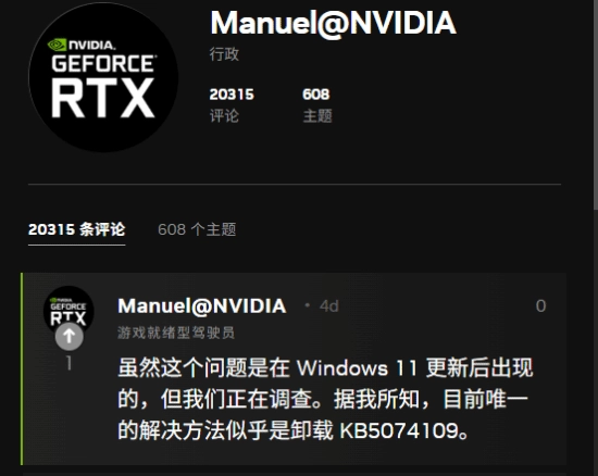 NVIDIA的代表Manuel在官方论坛上公开回应,明确表示该问题与Windows更新有关,并指出当前唯一的解决办法是卸载KB5074109。微软此前也已承认,该更新致使部分系统无法正常启动,随后推送了可选的补充更新KB5074105,旨在修复部分黑屏问题,不过此更新需要用户手动安装,而且针对游戏相关问题的修复效果尚未经过验证。