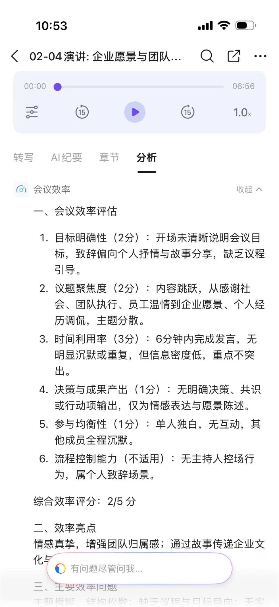 要是你觉得这样还不够简洁高效,也能让它开启分析流程——此时它会自动梳理出发言的核心逻辑与关键信息点,更有意思的是,它还能为会议效率打分。这些功能可比手机自带的AI录音机实用多了。