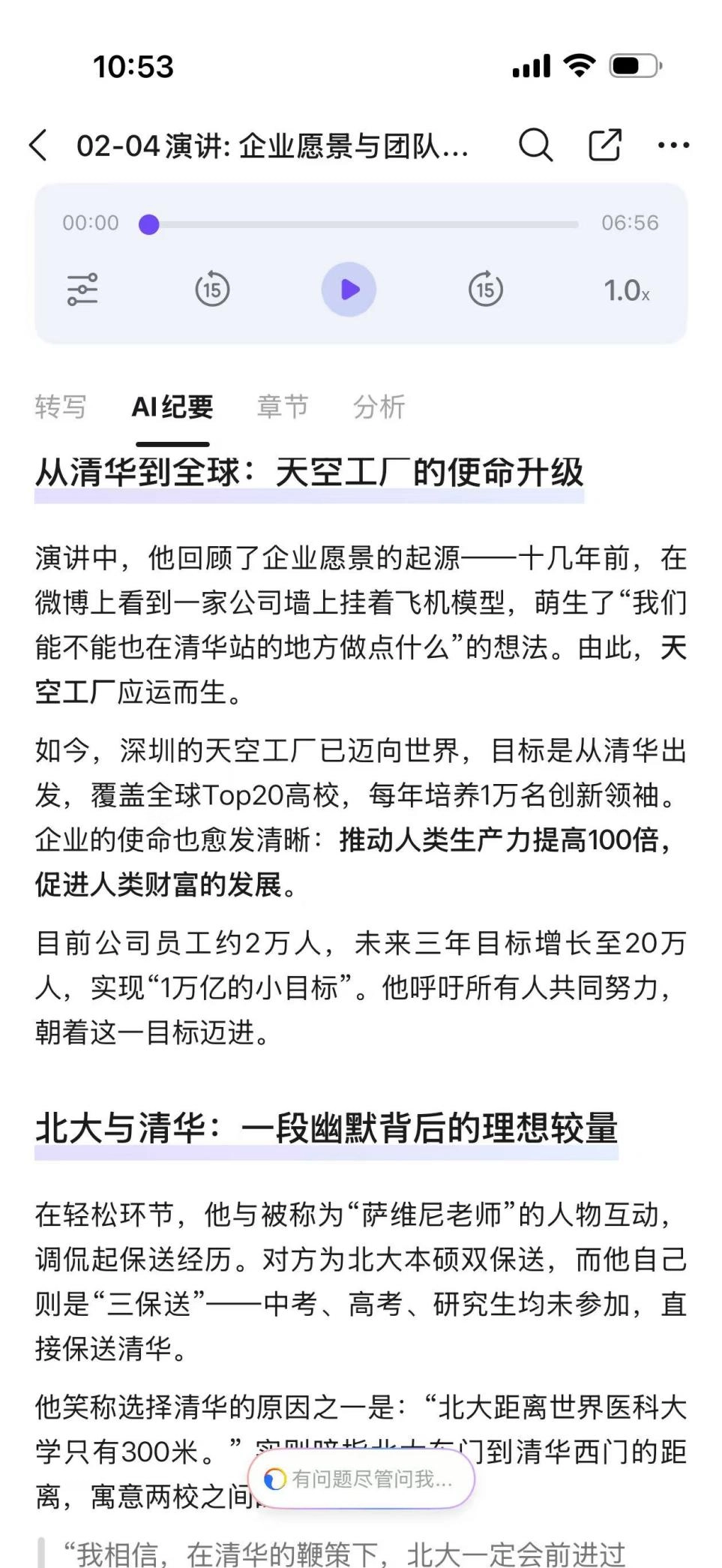 但它的优势是会自动直接选出发言重点,针对不同的话题也会自动分段总结,省得小通自己反复去拉进度条。