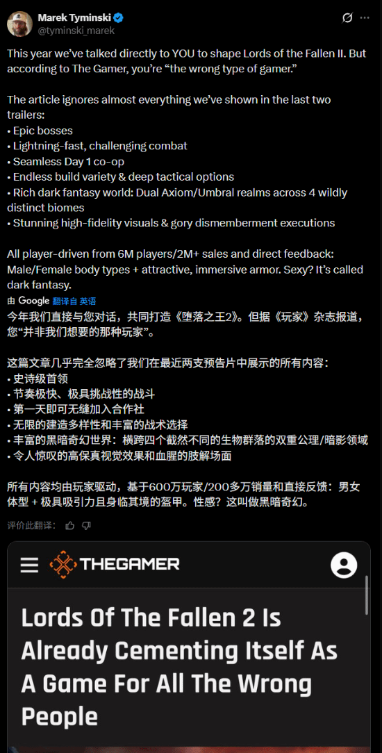 日前,外媒The Gamer发表了一篇关于《堕落之主2》的评论,称该作有意去除了所谓的“觉醒”或DEI相关内容。文章还暗示,这款游戏并非面向全体玩家,而是在讨好其眼中那些“政治不正确”的特定受众群体。