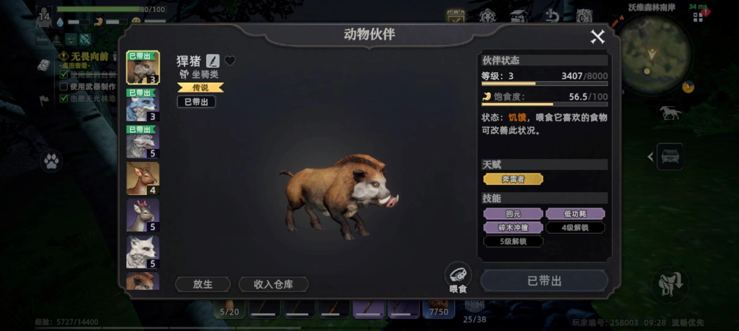 1、特点:碎木野猪是砍树专用的宠物,能够帮助玩家更高效地采集木材资源,对于前期的建设和生存至关重要。