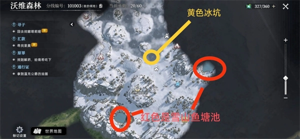 9、雪山冰坑中,特殊水产等待发现:巨大的冻湖巨虾在此全天游荡,它们同样会被三种饵料所吸引。
