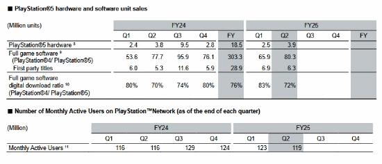 在2025财年第二季度,PlayStation平台全游戏软件的数字下载占比达到72%,进一步稳固了数字发行在此平台的主导地位。本季度全游戏软件总销量为8030万套,而第一方游戏的销量则为630万套。