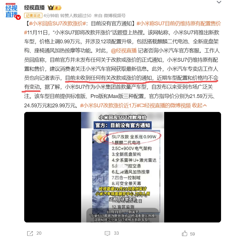 目前,改款配置与价格尚未获官方确认,懂车帝平台上现款SU7仍在正常销售。据经视直播报道,小米工作人员表示目前未收到任何关于改款或涨价的通知,近期车型的配置和价格均不会发生变动。