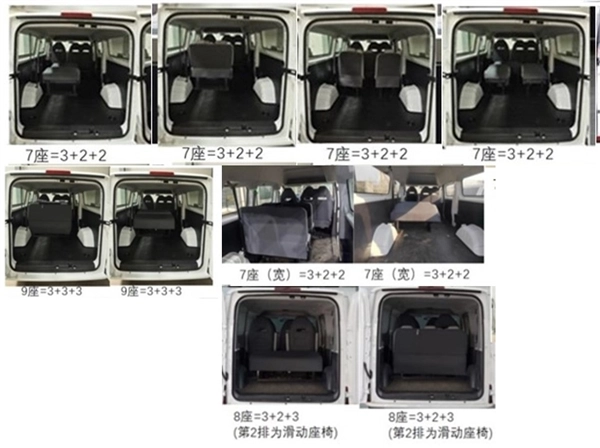 这款车有乘用和货用两个版本,二者的差异主要体现在窗户和座椅数量上。货运版的座椅最多仅能容纳3人,配备的是盲窗,并且需要张贴反光条;乘用版则进一步细分为7座、8座和9座这三种不同的配置。