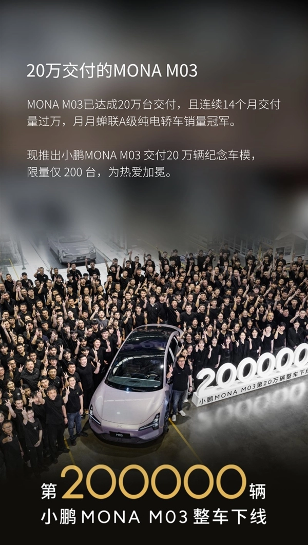 据了解,11月7日小鹏汽车对外公布,旗下车型MONA M03仅用14个月时间便实现交付20万台的里程碑,且该车辆已连续12个月交付量突破万台。