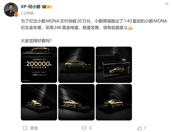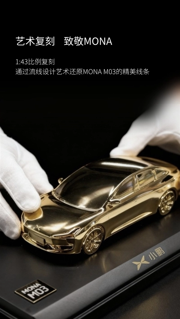11月11日消息,小鹏汽车董事长何小鹏透露,为庆祝小鹏MONA交付量突破20万台,小鹏商城特别推出1:43比例的小鹏MONA纪念金车模,该车模采用24K真金电镀工艺打造,全球限量200台发售。