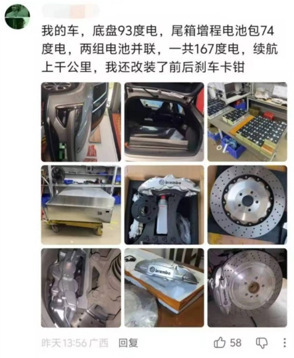 据这位网友介绍,车子原本就配备了93度的电池包,为了进一步提升续航能力,他直接在后备厢加装了额外的74度电池模组,宣称这样一来续航里程能突破一千公里。