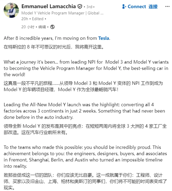 伊曼纽尔·拉马基亚(Emmanuel Lamacchia),前Model Y项目经理最近在社交平台官宣,自己将离开特斯拉。