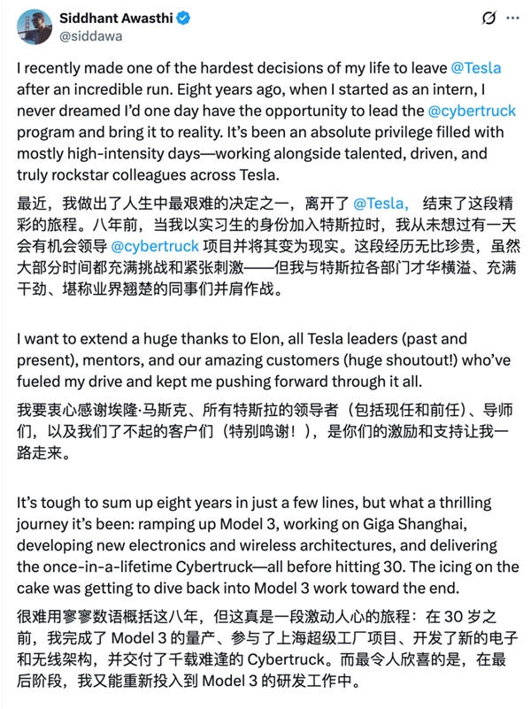 因为就在拉马基亚宣布辞职几个小时前,他的前同事,Model 3和Cybertruck负责人Siddhant Awasthi也表示要离职了。