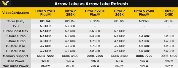 和265K相比,E核数量增加了4个,核心配置变为8P+16E共24核心,这一点与285K一致,不过频率参数没有任何变化。